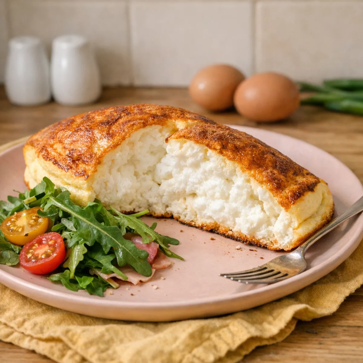 Сложите и подавайте: лопаткой аккуратно сложите омлет пополам (как книгу) и переложите на тёплую тарелку швом вниз. Подавайте сразу, пока не осел.