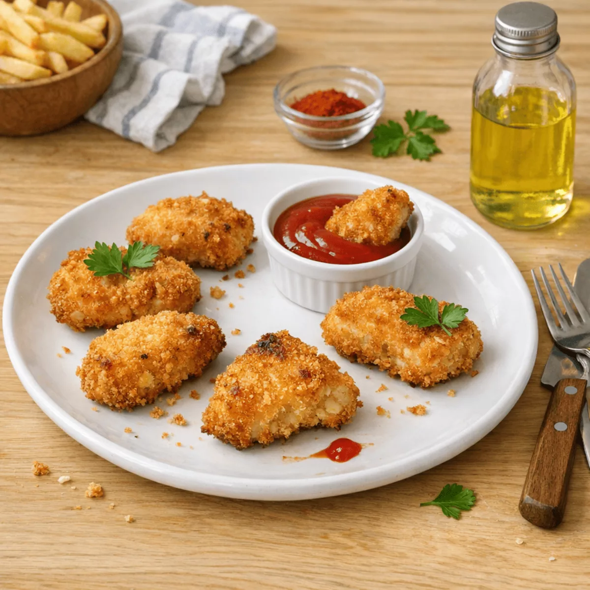 Выложите наггетсы в горячее масло в один слой, не прижимая друг к другу (оставьте ~2 см между кусочками). Жарьте 2,5–3 минуты с каждой стороны до равномерного золотисто-коричневого цвета.