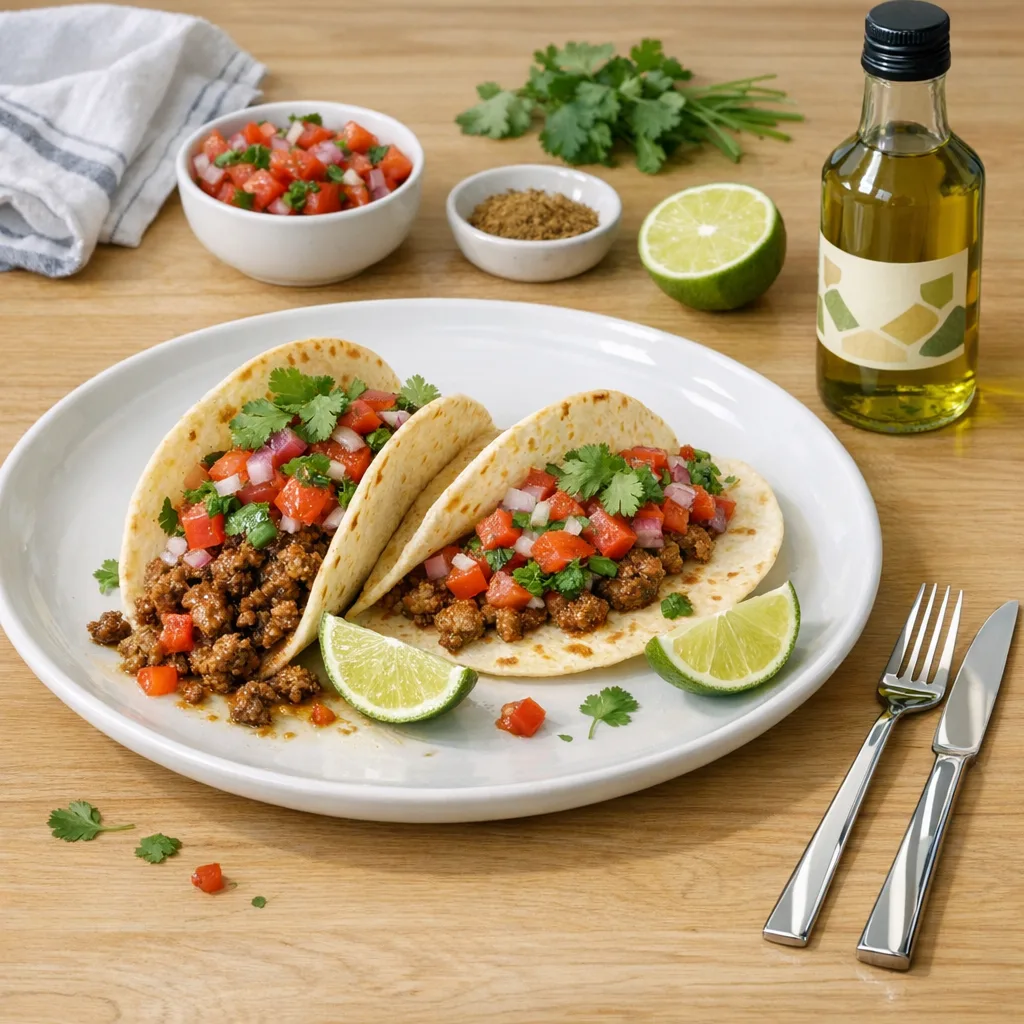Соберите тако: выложите 2–3 столовые ложки горячего фарша на тёплую тортилью, сверху — щедрую ложку свежей сальсы, выжмите дольку лайма (оставшаяся половина) и посыпьте кинзой — подавайте сразу.