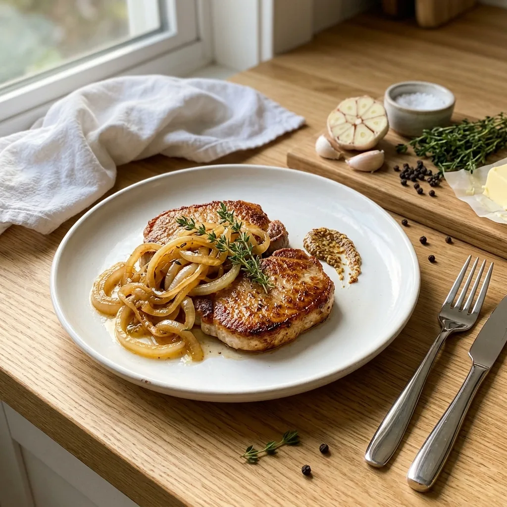 Обсушите медальоны бумажными полотенцами, посолите и поперчите с обеих сторон, посыпьте тимьяном — дайте постоять при комнатной температуре, пока готовите лук.
