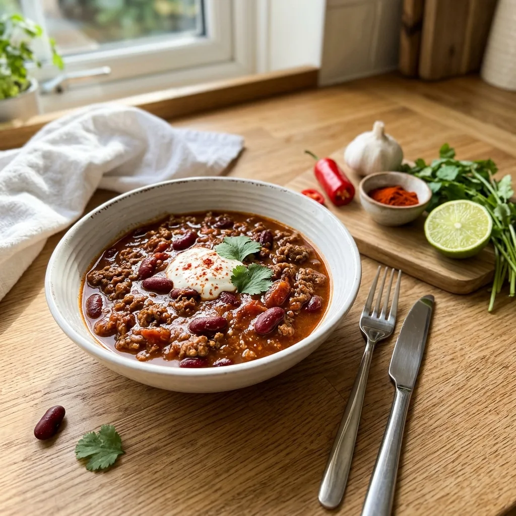 Убавьте огонь до минимального, накройте крышкой наполовину и томите 40–45 минут, изредка помешивая, до загустения соуса. Консистенция готового чили: соус не течёт с ложки, а медленно сползает.