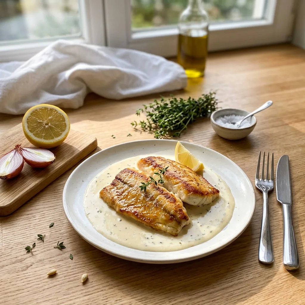 Верните рыбу в сковороду с соусом, убавьте огонь до минимального и прогревайте ровно 1–2 минуты — только до прогрева, без кипячения. Добавьте лимонный сок, попробуйте соус на соль и кислоту, при необходимости скорректируйте и подавайте немедленно.