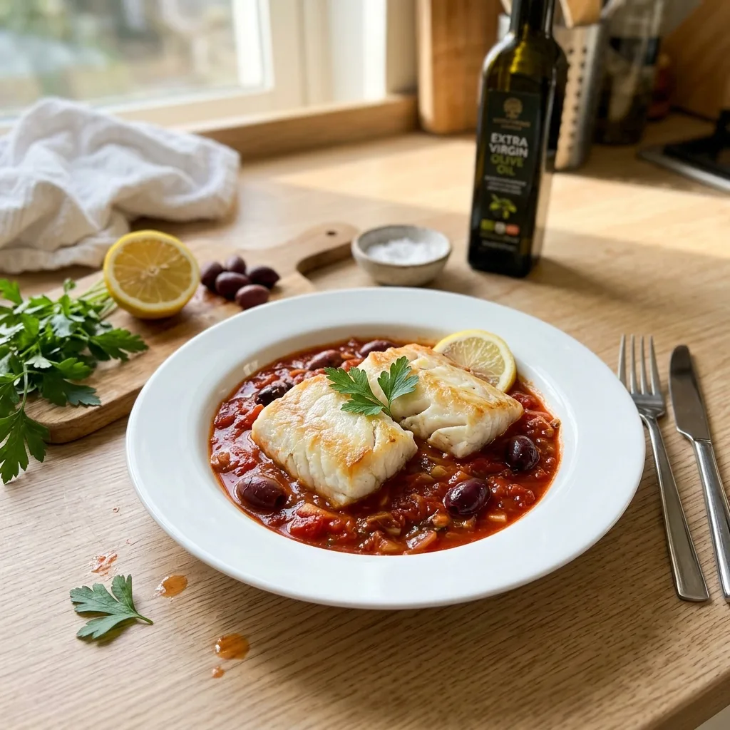 Рыба по-гречески с томатами и оливками Каламата на сковороде