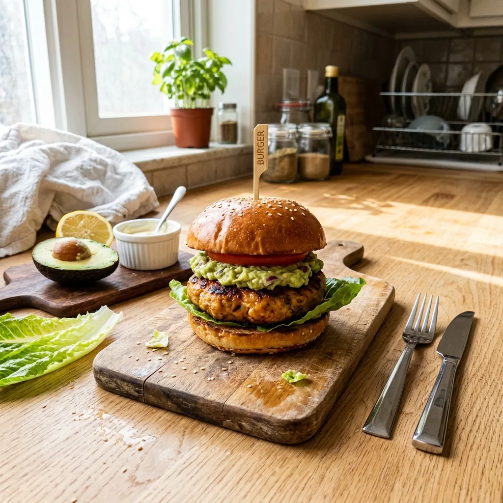 Соберите бургер снизу вверх: нижняя булочка → майонезный соус → лист салата → котлета → авокадо → томат → верхняя булочка с соусом. Подавайте сразу — бургер не ждёт.