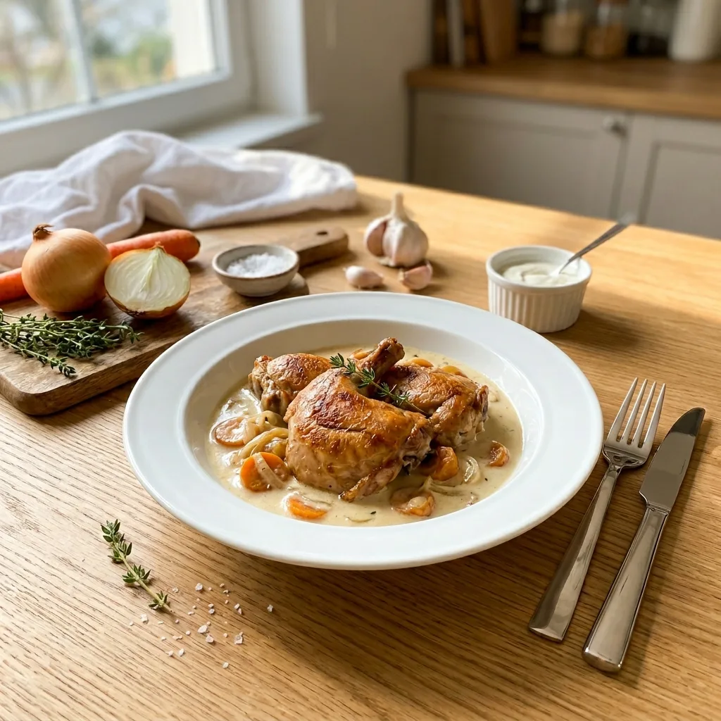 Проверьте готовность: мясо должно легко отходить от кости при нажатии вилкой, внутренняя температура — 74°C. Соус должен быть густым и обволакивающим — если жидковат, снимите крышку и уварите 5–7 минут на среднем огне. Посолите и поперчите соус по вкусу финально.
