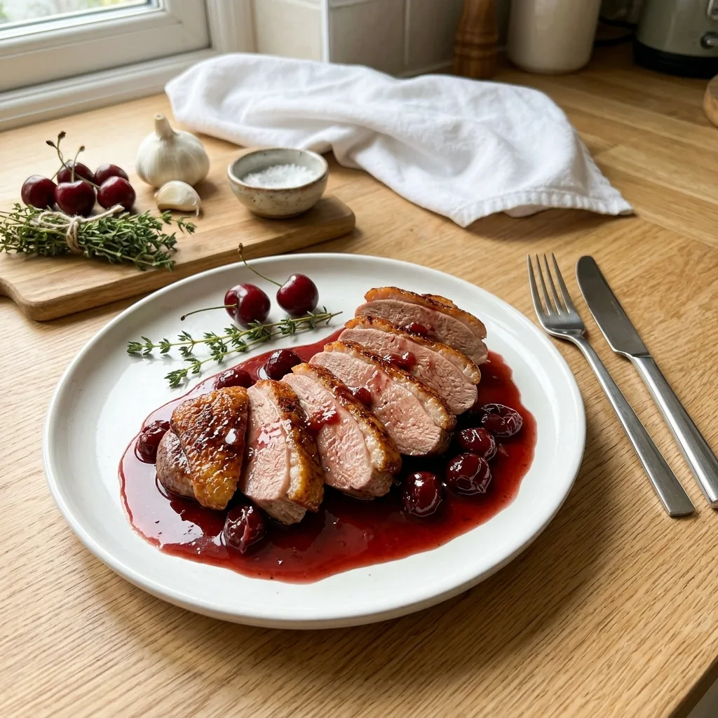 Утиная грудка с вишнёвым соусом, обжаренная на сковороде и доведённая в духовке по-французски