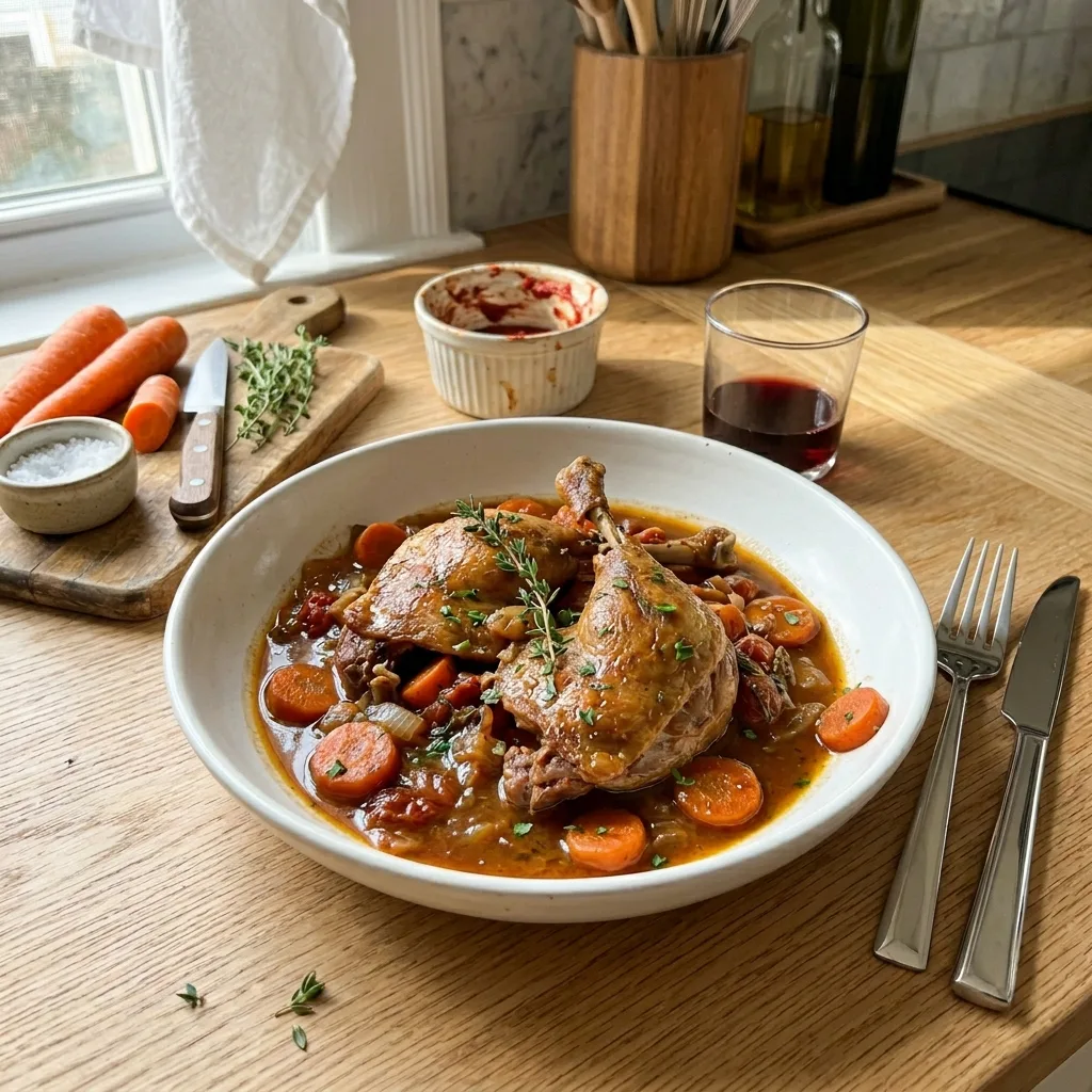 Проверьте готовность: мясо должно легко отходить от кости, внутренняя температура — 77°C. Снимите крышку, удалите тимьян и лавровый лист. Если соус жидковат — уварите на среднем огне 8–10 минут без крышки до густоты, обволакивающей ложку. Попробуйте финально — при необходимости досолите. Подавайте сразу.