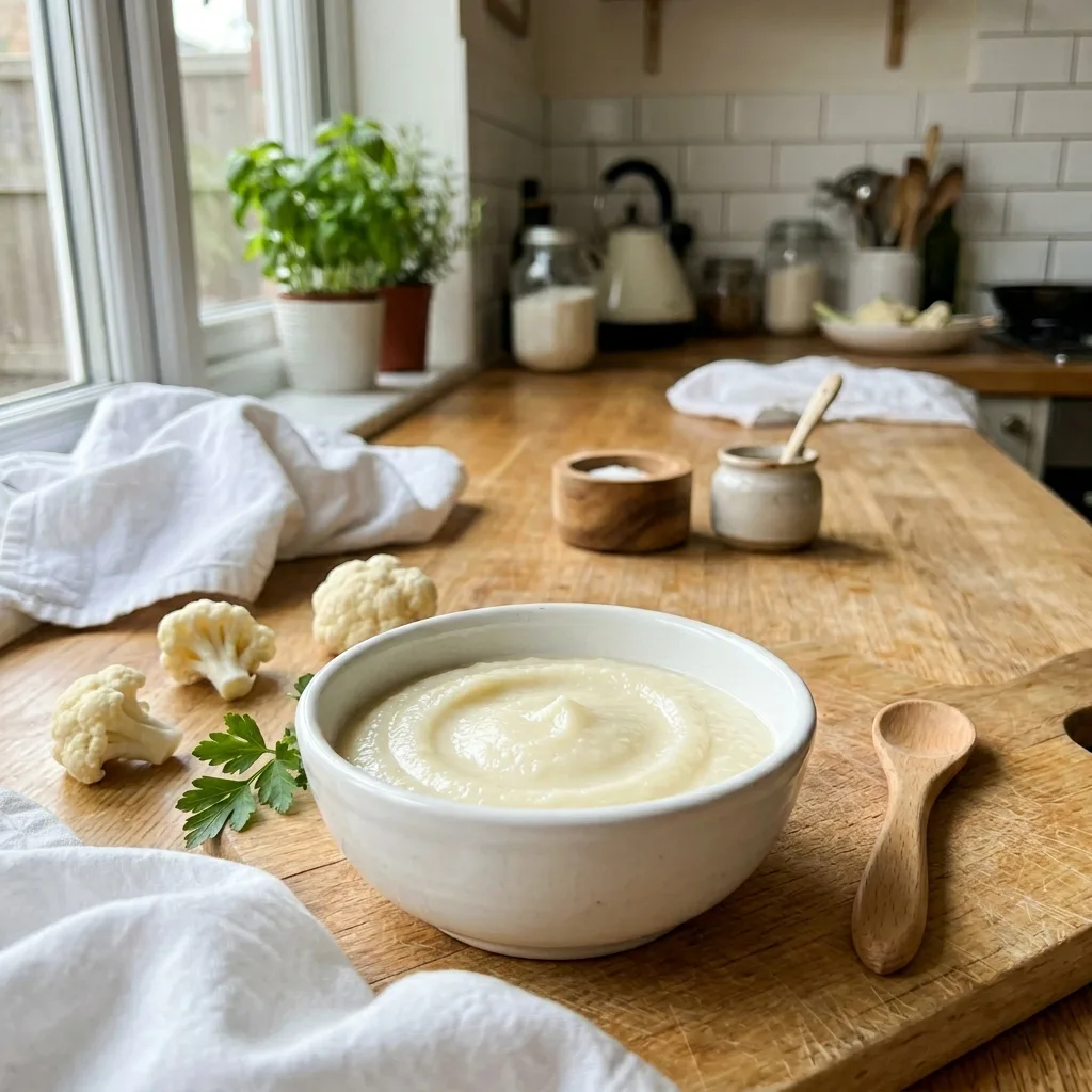 Пробейте капусту погружным или стационарным блендером до абсолютно гладкой, однородной консистенции без комочков. Если пюре густовато, добавьте 1–2 столовые ложки кипячёной воды и пробейте ещё раз.
