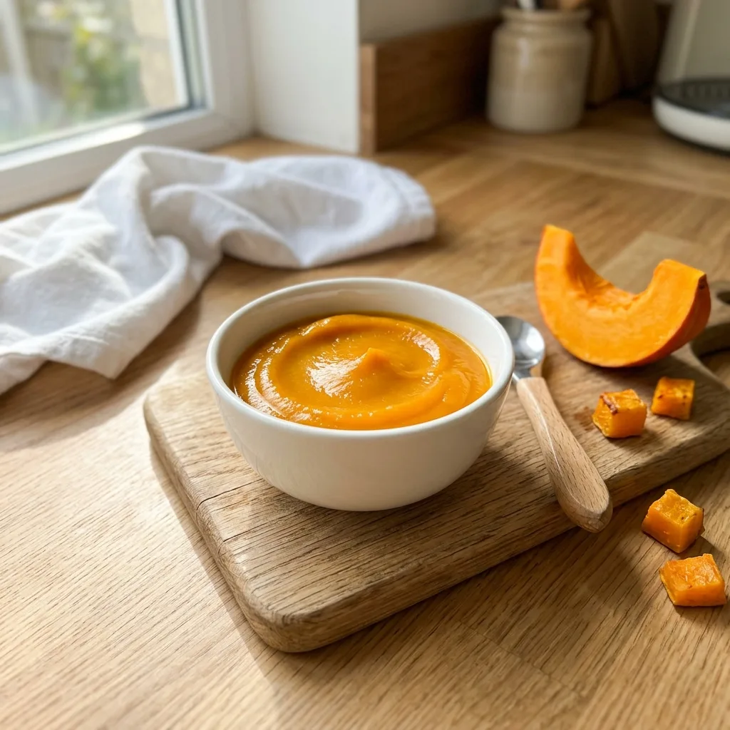 Пробейте тыкву погружным или стационарным блендером до абсолютно гладкой, однородной консистенции без комочков и волокон. Если пюре получается слишком густым, добавляйте по 1 столовой ложке кипячёной воды и пробивайте снова до достижения нужной консистенции — она должна медленно стекать с ложки.
