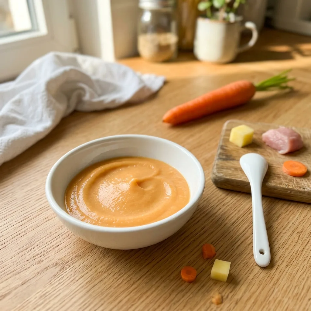 Остудите пюре до температуры тела (~37°C), проверив каплю на внутренней стороне запястья — должно быть едва тёплым. Подавайте сразу.