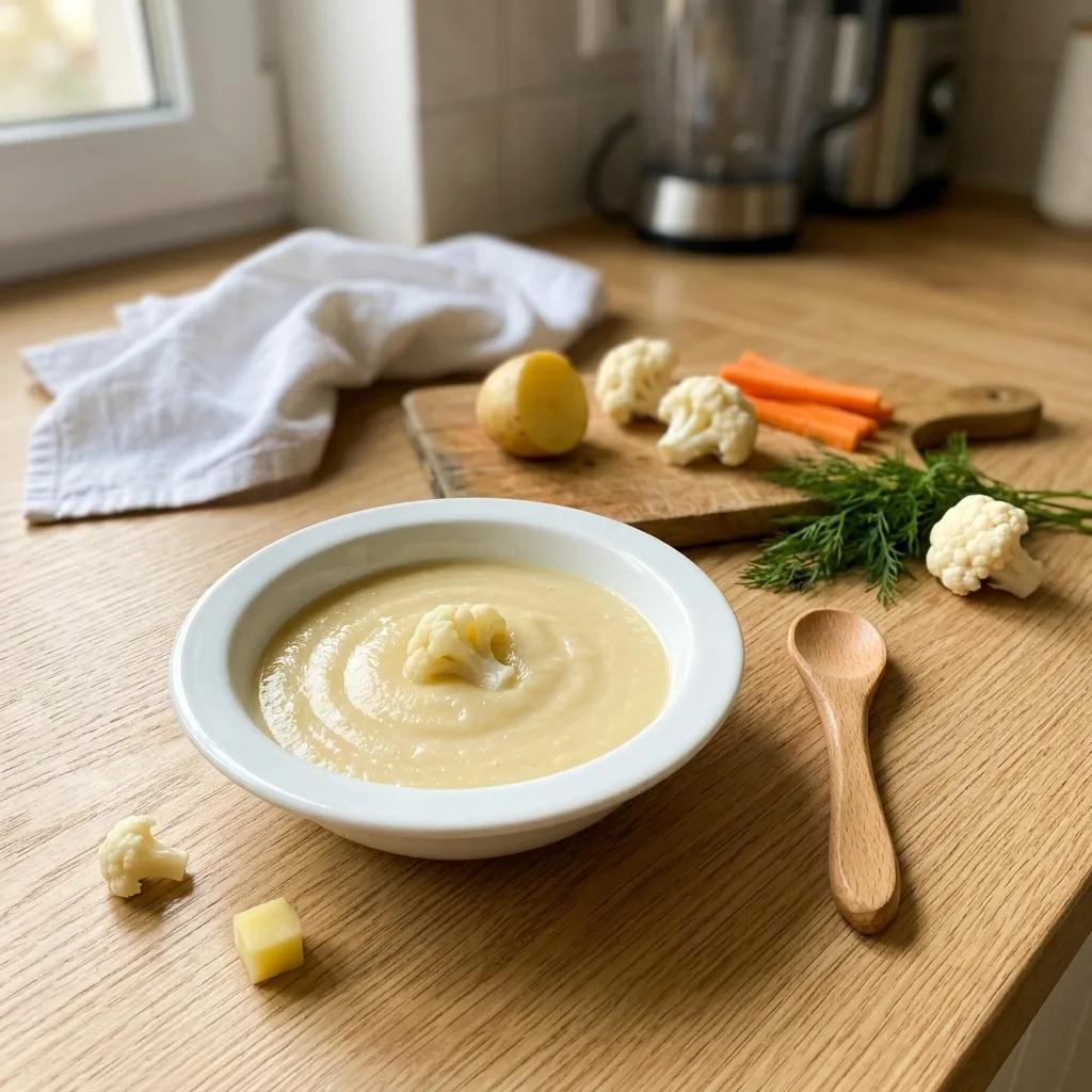 Снимите кастрюлю с огня и погружным блендером пюрируйте суп прямо в кастрюле 1,5–2 минуты до полностью однородной гладкой консистенции без комочков. Если суп слишком густой — добавьте 2–3 ст. л. горячей кипячёной воды и пюрируйте ещё 30 секунд.