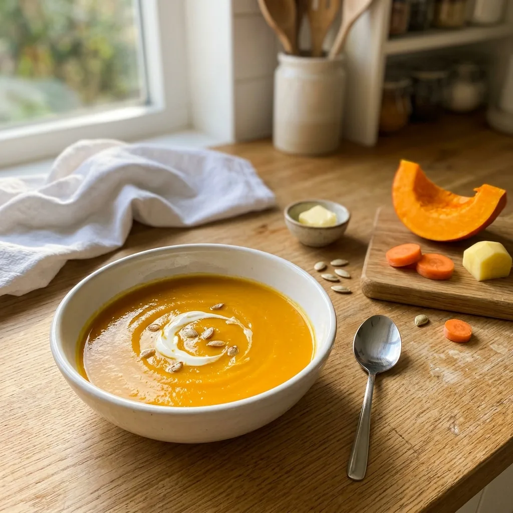 Убавьте огонь до среднего, накройте крышкой и варите 20 минут. Готовность проверьте вилкой: она должна входить в тыкву и морковь без усилий, как в мягкое масло.