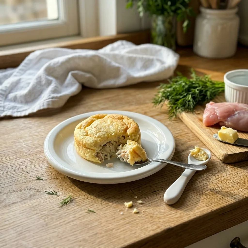 Добавьте взбитый белок в мясную массу в 2–3 приёма, каждый раз аккуратно перемешивая лопаткой снизу вверх круговыми движениями — не мешайте активно, иначе белок осядет и суфле не поднимется. Смажьте 4 силиконовые формочки объёмом 100–120 мл сливочным маслом, заполните мясной массой на ¾ высоты — суфле поднимется при запекании. Поставьте формочки на противень с горячей водой в духовку и запекайте 30–35 минут при 180°C. Проверьте готовность: вставьте деревянную зубочистку в центр суфле — она должна выйти чистой, без следов сырого фарша; внутренняя температура готового суфле — не менее 74°C.