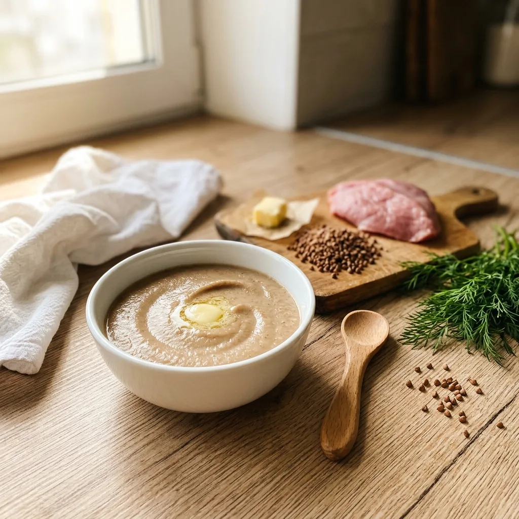 Переложите варёную телятину и готовую гречку в чашу блендера, добавьте 4–5 ст. л. (60–80 мл) тёплого мясного бульона и пюрируйте на высокой скорости 2–3 минуты до однородной гладкой консистенции без волокон и комочков.