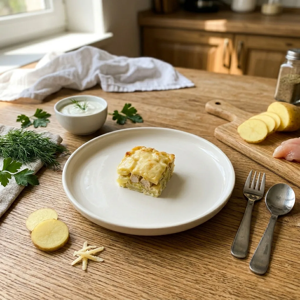Выложите слои в форму: первый слой — картофель (половина от общего количества), второй слой — лук, третий слой — куриное филе, четвёртый слой — оставшийся картофель. Каждый слой слегка прижмите лопаткой.