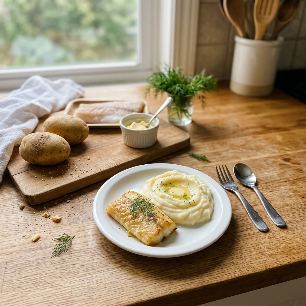 Подавайте сразу: на детскую тарелочку выложите 80 г картофельного пюре и рядом — кусочек запечённого минтая (80 г). Убедитесь, что температура блюда комфортная — не более 40–45°C.