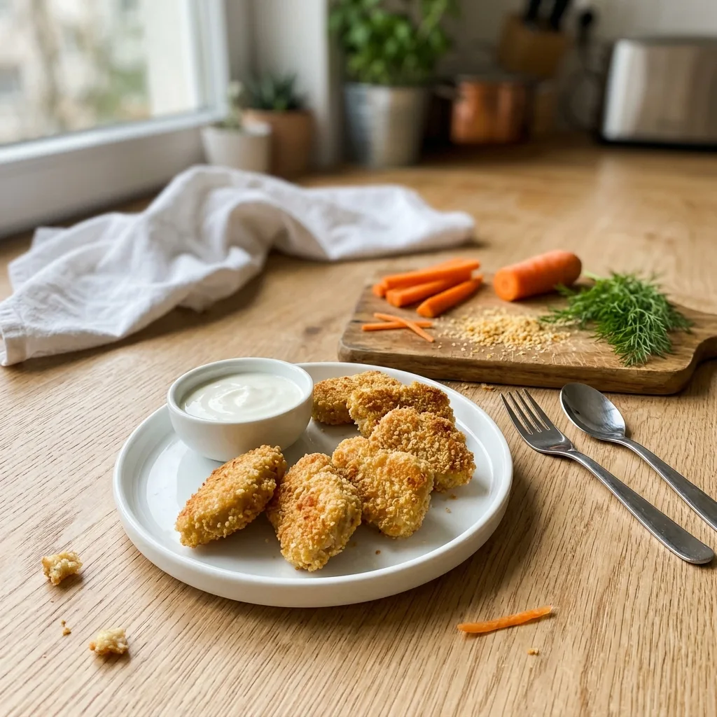 Запекайте на среднем уровне духовки при 190°C в течение 22–25 минут. На 12-й минуте аккуратно переверните каждый наггетс лопаткой — это обеспечит равномерную золотистую корочку с обеих сторон.