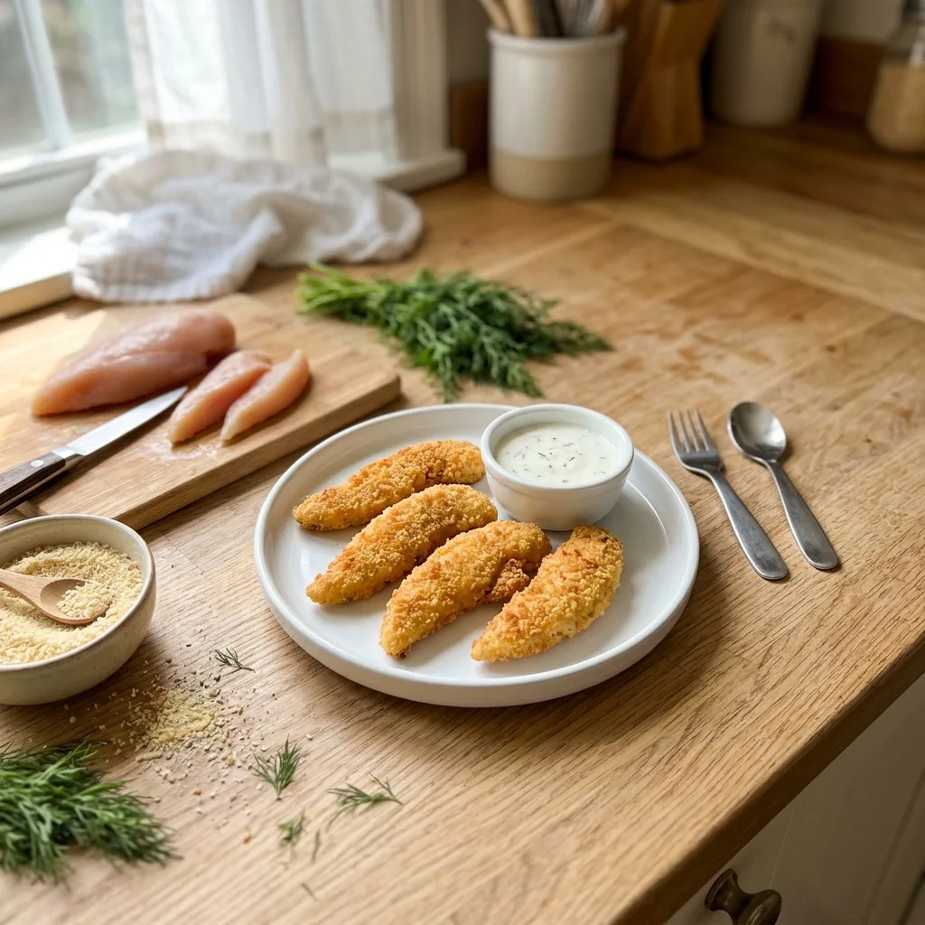 Проверьте готовность: разрежьте один «Пальчик» — внутри он должен быть полностью белым, без розового цвета (внутренняя температура 74°C). Остудите до комфортной температуры (~50°C) перед подачей ребёнку — проверьте на запястье.