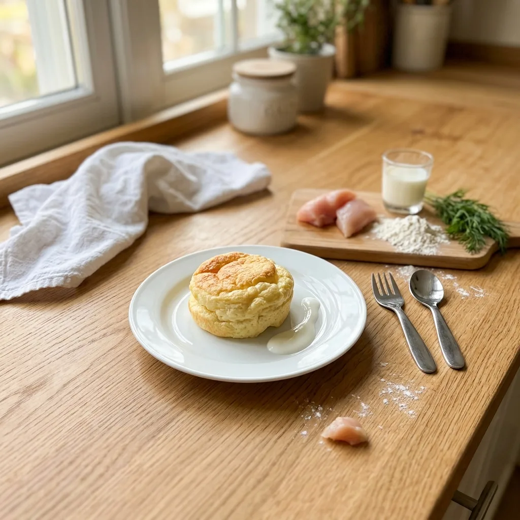 Аккуратно введите взбитые белки в куриную массу в три приёма, каждый раз перемешивая силиконовой лопаткой снизу вверх — не круговыми движениями, иначе пена осядет и суфле получится плотным, а не воздушным. Смажьте 4 порционные формочки объёмом 150–180 мл растительным маслом (1 ч. л. на все формы) и заполните куриной массой на ¾ высоты — при запекании суфле поднимется. Поставьте формочки в горячий противень в духовке и налейте в противень горячую воду из чайника так, чтобы она доходила до середины высоты формочек — это водяная баня. Запекайте при 180°C на среднем уровне духовки 30–35 минут. Готовность проверьте деревянной зубочисткой: воткните в центр суфле — она должна выйти чистой, без сырого теста; поверхность суфле должна быть светло-золотистой и слегка упругой при лёгком нажатии. Внутренняя температура готового суфле — 74°C (если есть кулинарный термометр).
