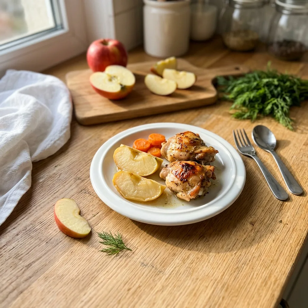 Выложите в форму слоями: сначала лук и морковь равномерным слоем на дно, затем кусочки курицы, сверху — дольки яблока. Полейте растительным маслом и добавьте воду (50 мл) — она создаст пар внутри формы и сохранит сочность мяса.