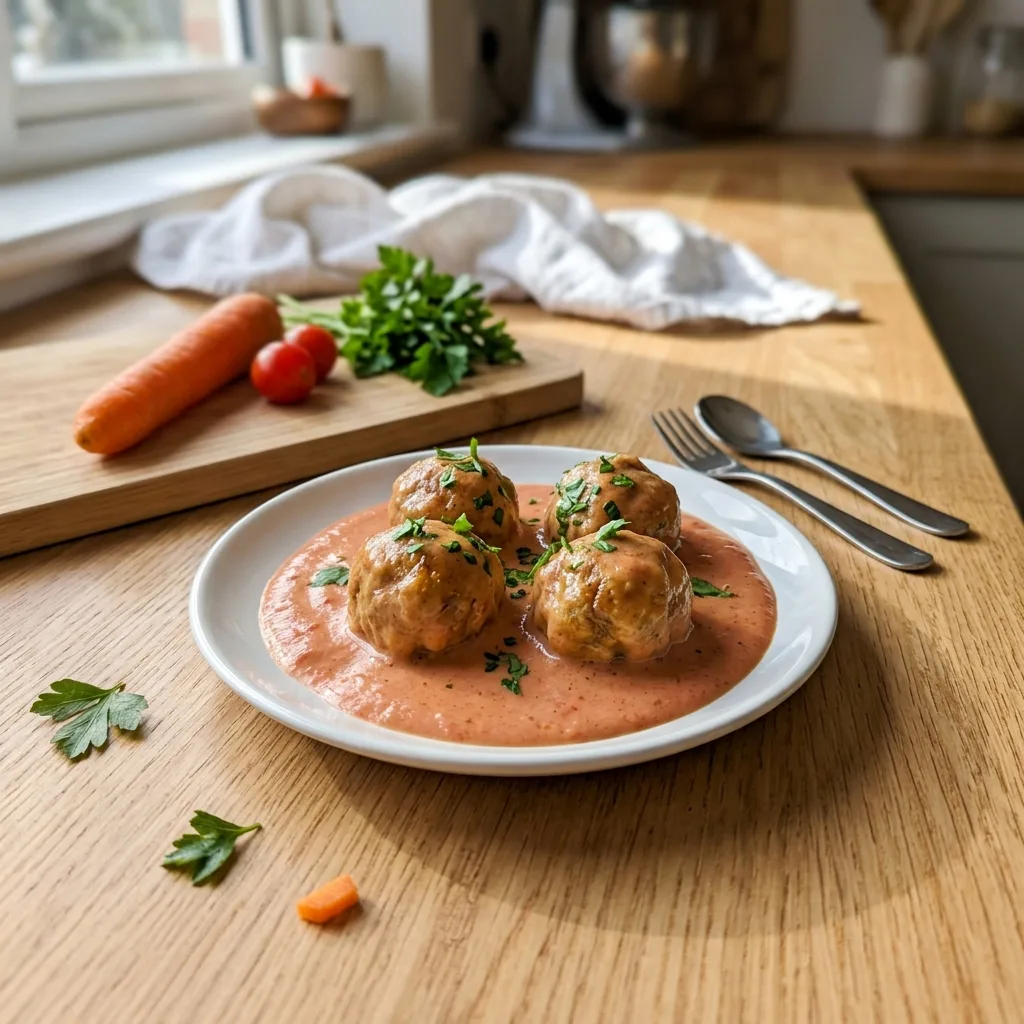 Добавьте щепотку соли (0,5 г) в соус по вкусу. Переложите запечённые тефтели в форму для запекания (20×20 см), залейте соусом так, чтобы он покрывал тефтели наполовину. Верните форму в духовку и запекайте ещё 15–20 минут при 180°C до загустения соуса. Соус должен стать кремово-розовым, обволакивающим тефтели.