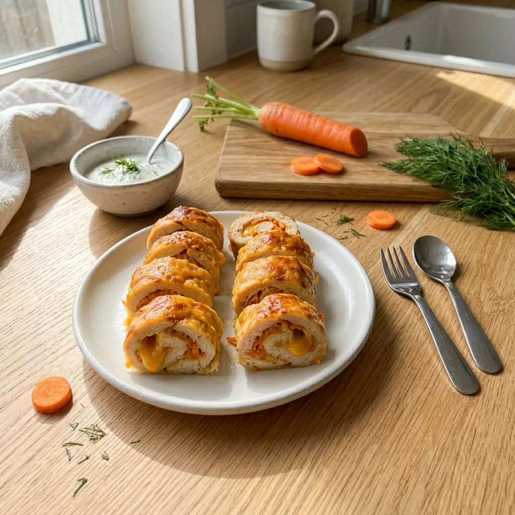 Достаньте рулетики из духовки, удалите зубочистки. Дайте остыть 5–7 минут перед подачей — внутри сыр очень горячий, остывание до ~55–60°C делает блюдо безопасным для ребёнка.