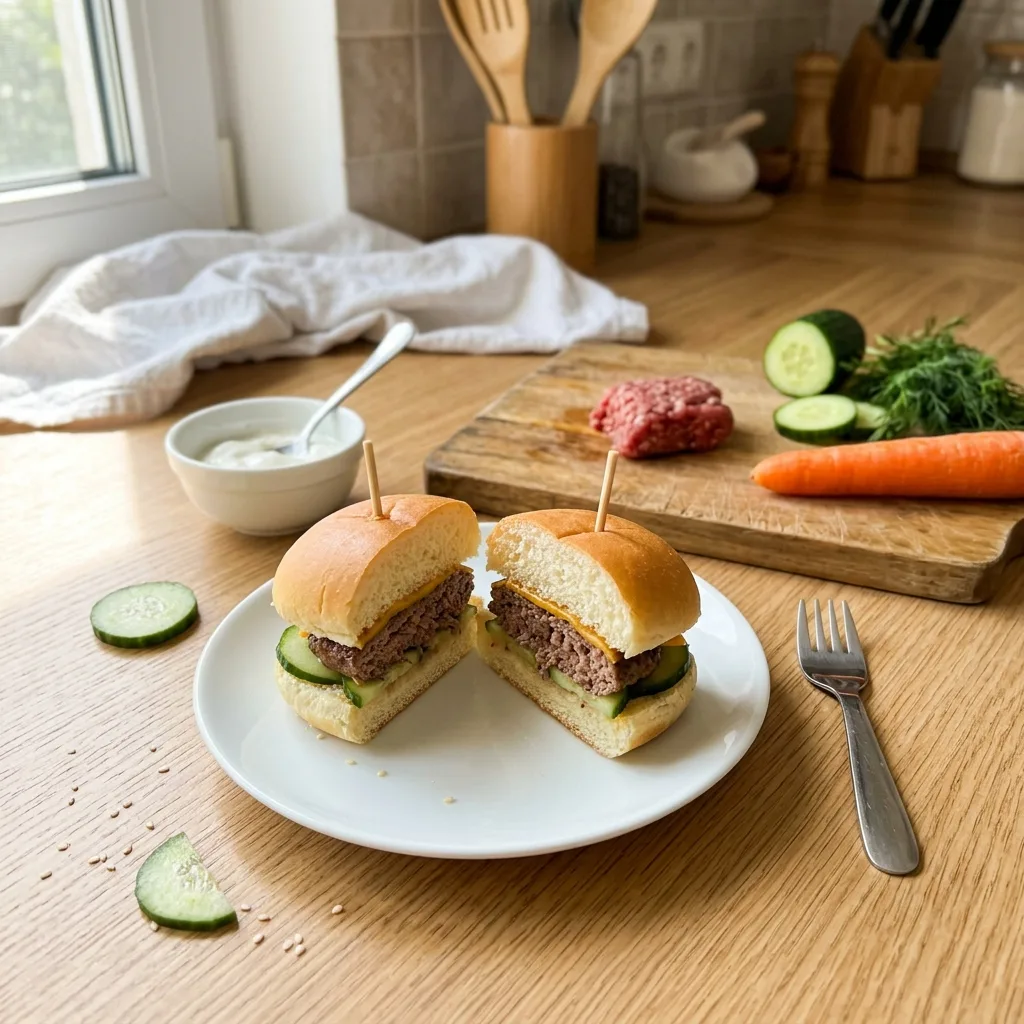 Запекайте котлеты в разогретой до 180°C духовке (режим верх+низ, средний уровень) в течение 20–22 минут. Готовность проверьте кулинарным термометром — внутренняя температура говядины должна достичь 71°C; или разрежьте котлету — сок должен вытекать прозрачным, без розового оттенка.