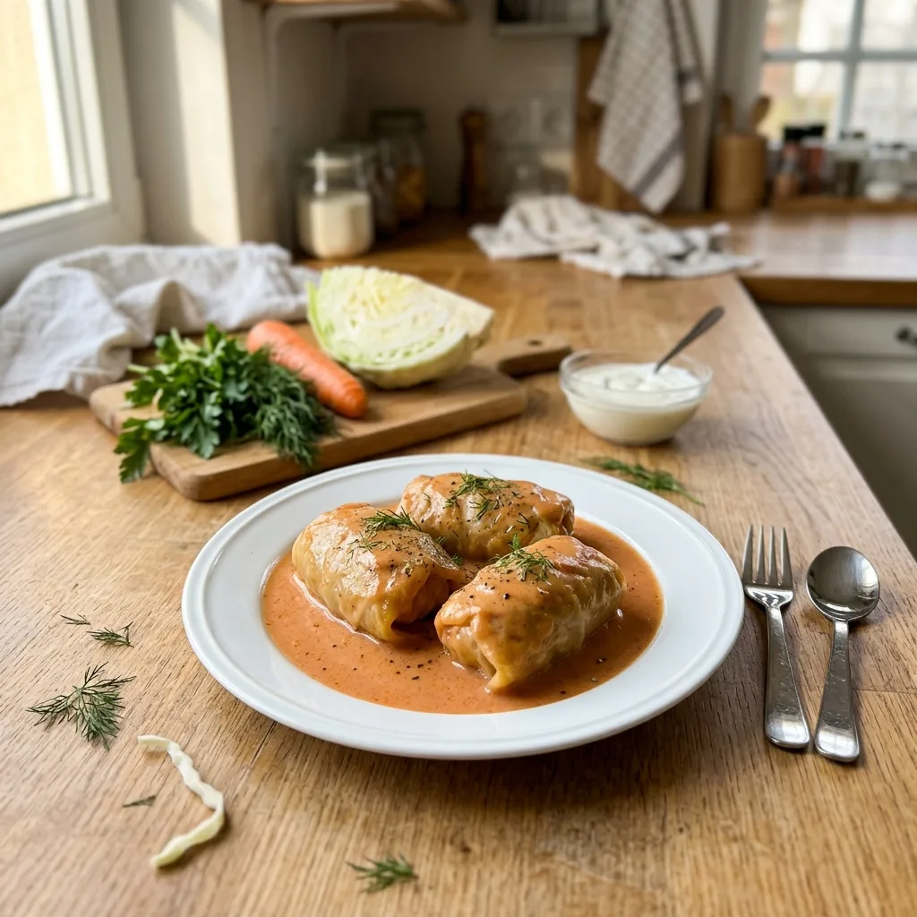 Выложите голубцы в подготовленную форму в один слой, на расстоянии 1–2 см друг от друга. Запекайте в духовке при 180°C, средний уровень, 15 минут — предварительное запекание без соуса «запечатывает» форму голубцов, они не разваливаются при последующем тушении.
