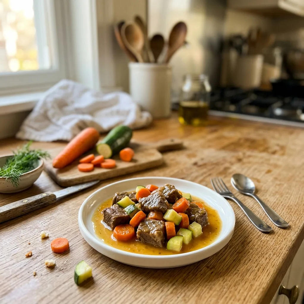 Проверьте готовность мяса: проткните самый крупный кусочек вилкой — он должен легко разделяться на волокна, внутренняя температура говядины — не менее 75°C. Добавьте минимальную щепотку соли (до 1 г), перемешайте. Удалите лавровый лист. Подавайте сразу, разложив по детским тарелкам — мясо с овощами и небольшим количеством соуса.