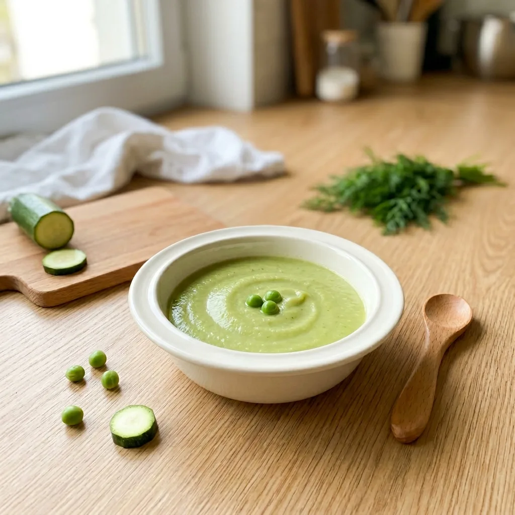 Для идеальной гладкости протрите суп через мелкое сито — этот шаг необязателен, но рекомендуется при первом введении горошка: сито удаляет остатки кожицы и делает текстуру бархатистой. Если суп слишком густой — добавьте 2–3 ст. л. горячей воды и ещё раз перемешайте блендером.