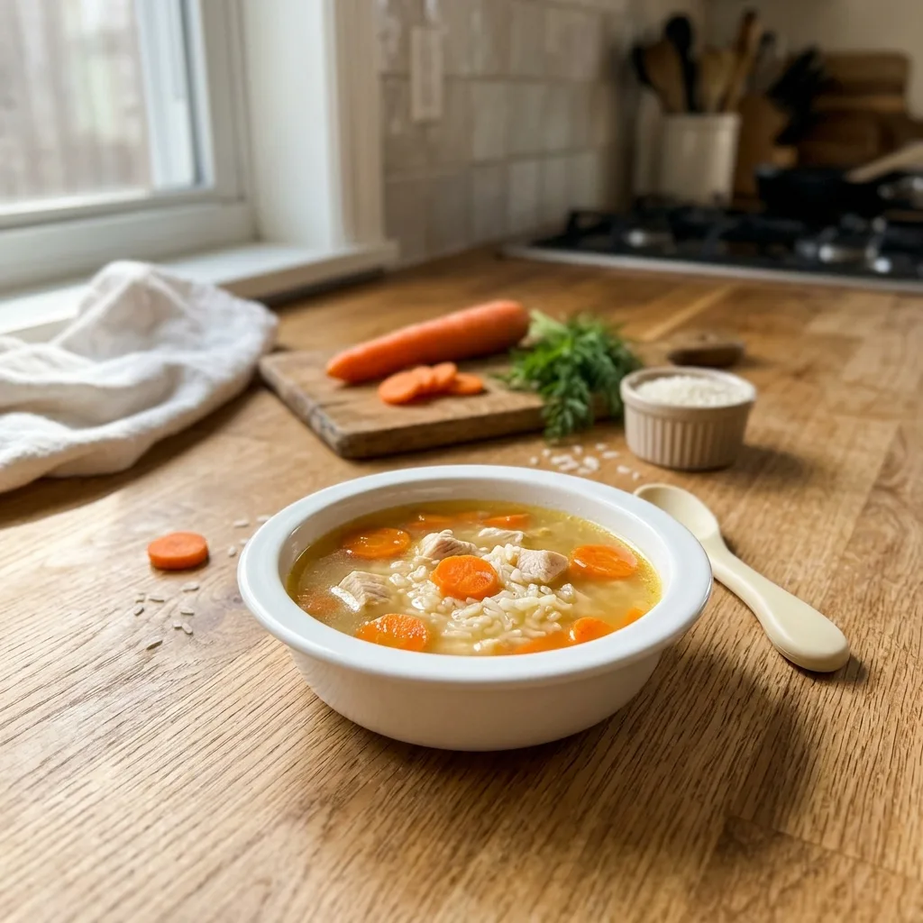 Добавьте промытый рис, морковь и лук в кастрюлю с готовой курицей и бульоном. Доведите до кипения на среднем огне, затем убавьте до минимального.