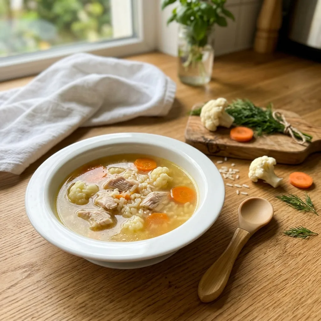 Промойте рис под холодной проточной водой 2–3 раза до прозрачности воды — это удаляет лишний крахмал и предотвращает чрезмерное загустение бульона.