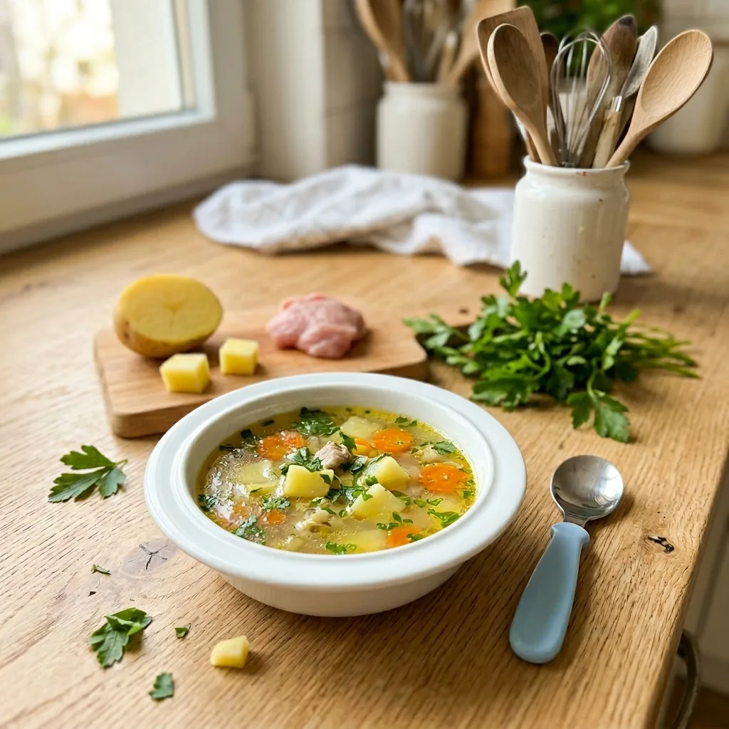 Если используете соль — добавьте минимальную щепотку (0,3 г), перемешайте. Остудите суп до комфортной температуры (~50°C) перед подачей и проверьте на запястье — должно быть тепло, но не горячо.