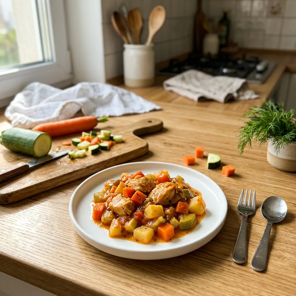 Остудите рагу до комфортной температуры подачи (~50–55°C) и выложите порцию (~170 г) на детскую тарелку. Подавайте сразу.