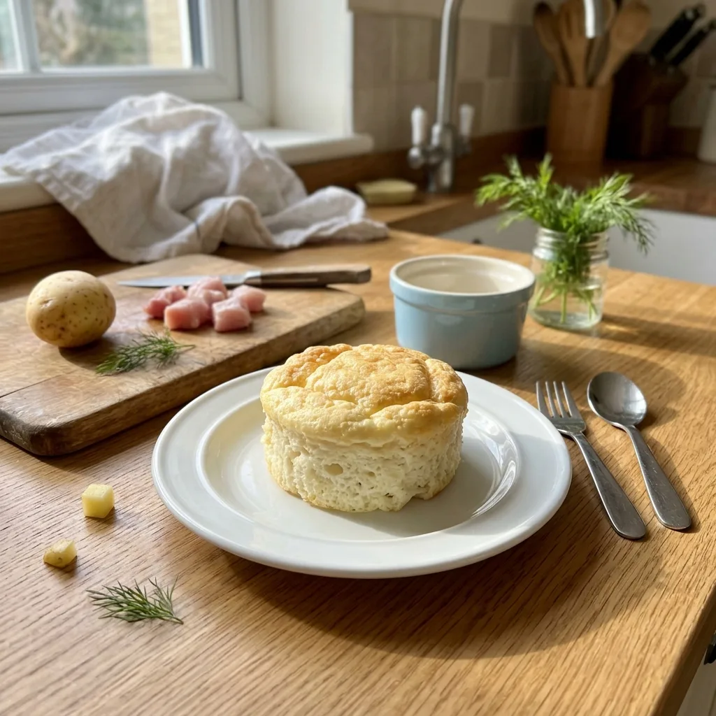 Очистите картофель (150 г), нарежьте кубиками 2 см и отварите в несолёной воде 15–18 минут до полной мягкости — картофель должен легко разминаться вилкой без усилий. Слейте воду и разомните в однородное пюре, добавив молоко (80 мл) и сливочное масло (10 г); остудите до комнатной температуры.