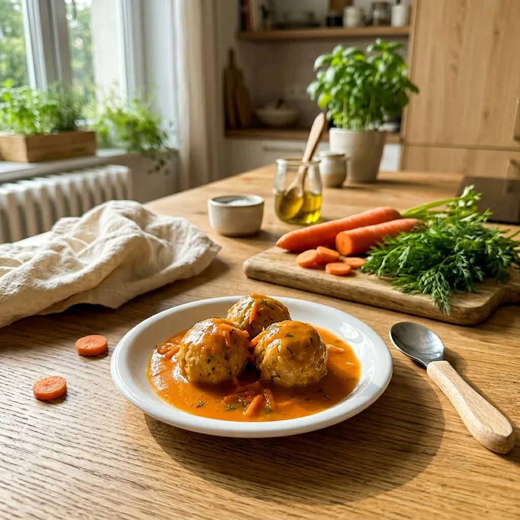 Уложите тефтели в форму для запекания в один слой, оставляя зазор 1 см между ними. Залейте морковным соусом так, чтобы он покрывал тефтели примерно наполовину — соус создаёт влажную среду при запекании и не даёт тефтелям пересохнуть.