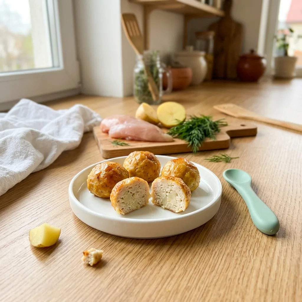 Запекайте на среднем уровне духовки при 180°C в течение 22–25 минут. Готовность проверьте, разрезав одну тефтелю: внутри не должно быть розового цвета, сок должен быть прозрачным — это соответствует внутренней температуре 74°C для куриного мяса.